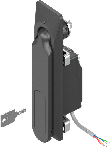 Zungenverschluss mit Rückmeldung und automatischer Öffnung bei Stromausfall; Open collector Ausgang A1 zeigt an, ob die Zunge in der Falle eingerastet ist
